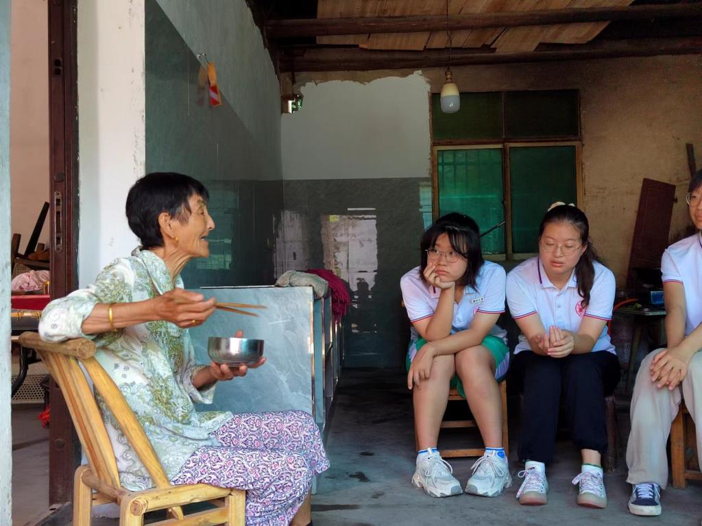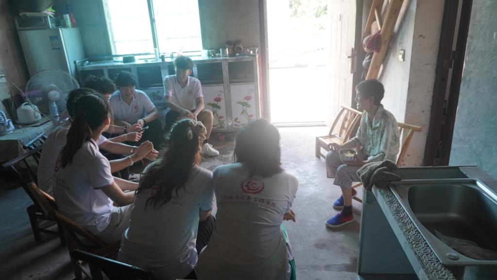 参观完水库后,队员们走在硚石社区的小路上,商量着待会儿走访哪户人家。刚上坡便看见一位年迈的老人坐在门口乘凉吃早餐,同我们亲切地交流之后。老人热情地接待了志愿队,积极地回答了志愿队提问地有关民生和“乡村振兴”的问题。