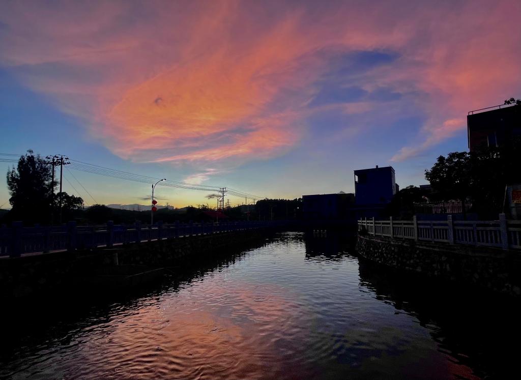 该日傍晚时分,成员们到达下湖村村头并幸运地欣赏到“霞湖”的绝美风光。