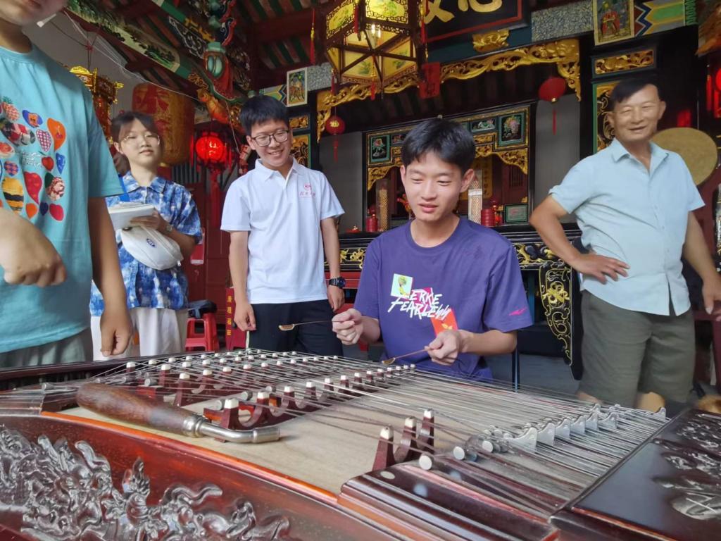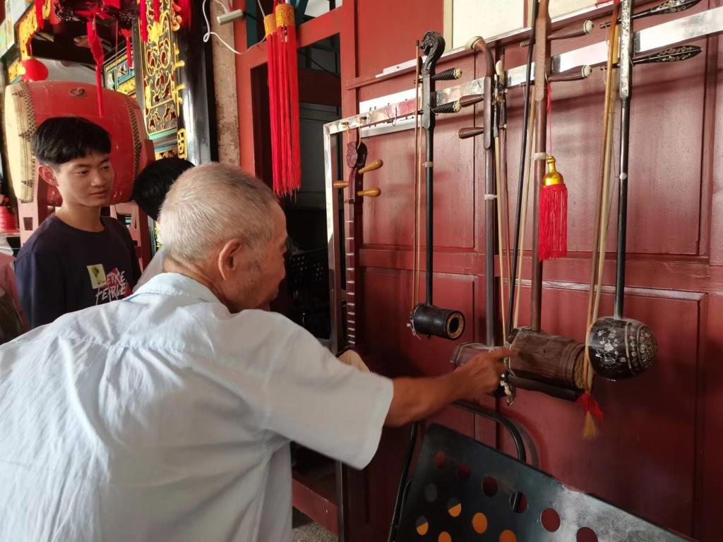 早就听林书记介绍过下湖潮剧团的辉煌历史,队员们终于在林氏宗祠内见到了这群老艺术家们。或出于身体原因,或被生活所迫,原来十几个人的乐团,如今只有六七位成员愿意不时聚集于此,弹奏陪伴他们几十载的潮乐。今天有四位老乐团成员来到现场,一位弹奏扬琴,三位拉响二胡。队员们有幸听到了五首现场演奏的传统潮乐。五曲听罢,队员们感受民乐的同时,也在林老爷爷的介绍下挥动琴竹,弹奏扬琴。