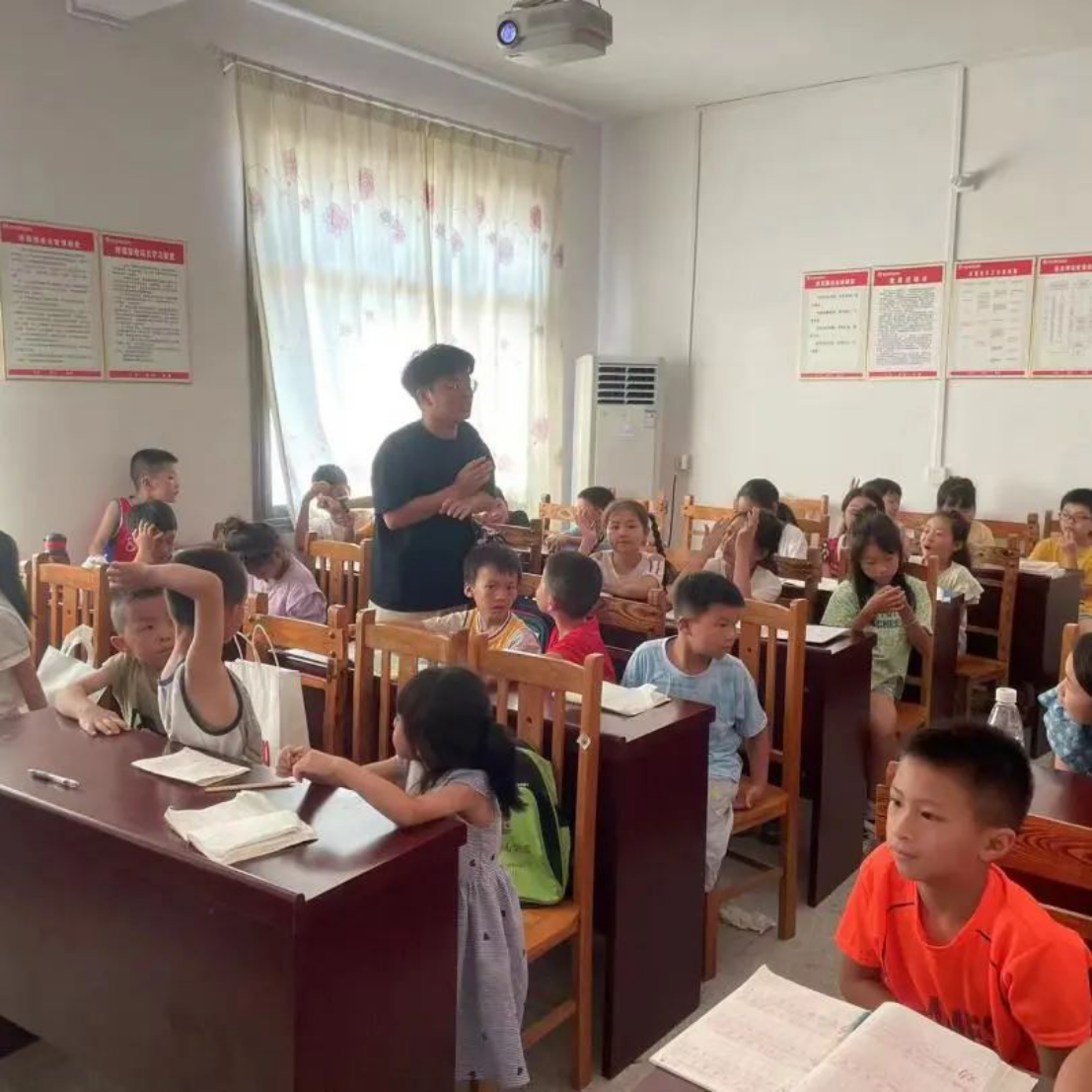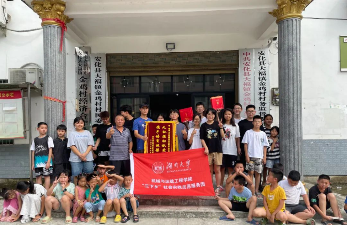 球王会体育官网机载寻梦志愿团于7月9日到达安化县大福镇金鸡村,开展了为期十天,以教育关怀为主题的暑期实践活动。在村委楼临时的教室里,孩子们在哥哥姐姐们的耐心引导下,积极发言、主动表达,在轻松、活跃的课堂氛围中掌握了防溺水、未成年人保护、用火用电安全等实用知识。实践队成员还精心准备了阅读分享、历史故事等课程引导金鸡村的孩子们树立正确的价值观,并通过介绍不同地区的民俗文化,在孩子们心中种下向往更加广阔世界的种子。