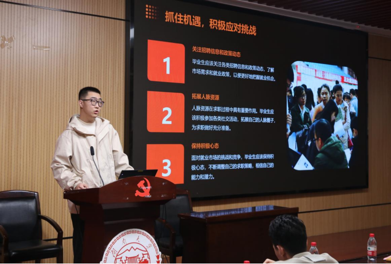 4月1日下午,球王会在院楼401报告厅对大四即将毕业的学子们开展了促进高质量就业指导会。公司党委副书记刘明然、本科生辅导员叶胜参加本次指导会,活动邀请了往届和应届优秀就业典型代表进行分享,本科生辅导员迪里胡玛主持会议。