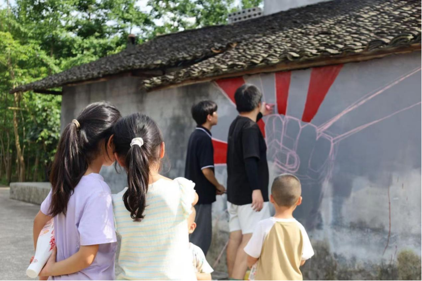 在绘制过程中,向书记亲临现场,对团队成员的工作表示关心与支持。不少村民也主动和团队成员交流,尽管乡音难辨,但志愿者们仍能感受到他们话语中的喜悦;孩子们则更为热情,争相提出帮忙绘制墙绘的想法。在一片欢声笑语中,“螺丝钉”团队齐心协力,墙绘工作稳步推进,圆满完成当天的目标。