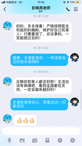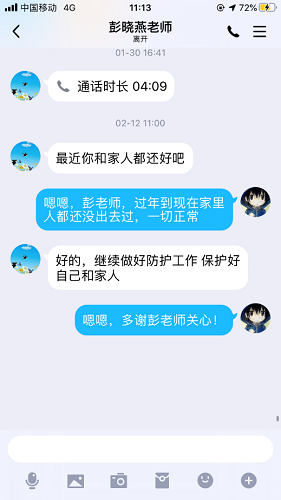2020年1月20下午,钟南山院士证实了新型冠状病毒肺炎的“人传人”现象。在得知疫情的严重性之后,彭晓燕老师第一时间给她的员工们通了电话,询问了他们的身体健康情况和家人的健康情况,并鼓励他们不用过多担心,保持良好的心态,做好自身和家人的防护工作。彭晓燕老师也多次通过线上聊天等方式向员工予以关心。