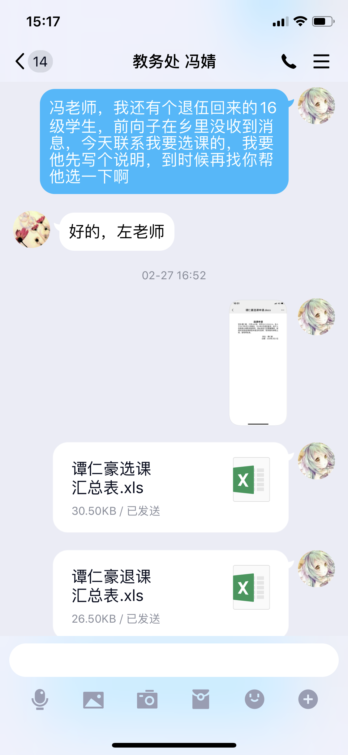 还有一名退伍回来复学的16级员工谭仁豪,之前因为在老家,不方便上网,错过了选课时间,在了解情况后,左老师找到教务处老师,帮他补选课,因为他选课学分已超过上限,普通物理A(1)和高等数学A(2)两门课程只能选一门,左老师跟员工再次沟通,因为下学期普通物理A(1)不会开课,建议他先选普通物理A(1),下学期再选高等数学A(2),这样下学期修完其他课程就可以毕业,不需要再耽误一学期。