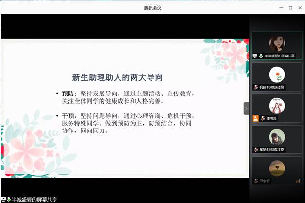 最后,闫老师着重讲了如何帮助新生调节情绪以及新生助理工作时的两大导向,预防和干预。她讲到新生助理可以通过主题活动、班级宣传等多种方式教育新生,引导新生,关注全体同学的健康成长和人格完善。同时机械院建立了五级联动的心理健康教育体系,通过个人、寝室、班级、公司、公司层层关注,实现心理问题的尽早发现、心理健康教育和心理危机干预效果的最大化。