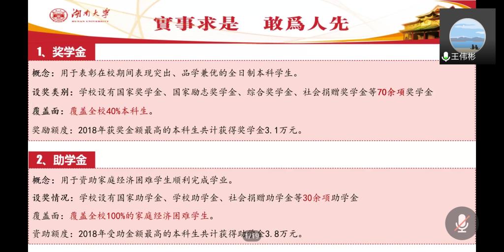 随后,在工作政策方面,王伟彬老师通过对奖学金、助学金、助学贷款、勤工助学、困难补助、学费减免、绿色通道、惠民工程和学费补偿九个方面的介绍,展示了湖大目前全覆盖的资助政策体系。除此之外,他还向参会人员简单展示了2019年员工奖助学金的大致情况,梳理了各项政策审核的重要时间节点。