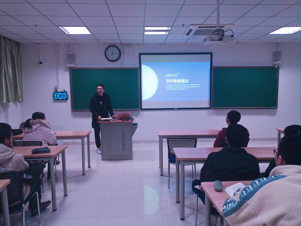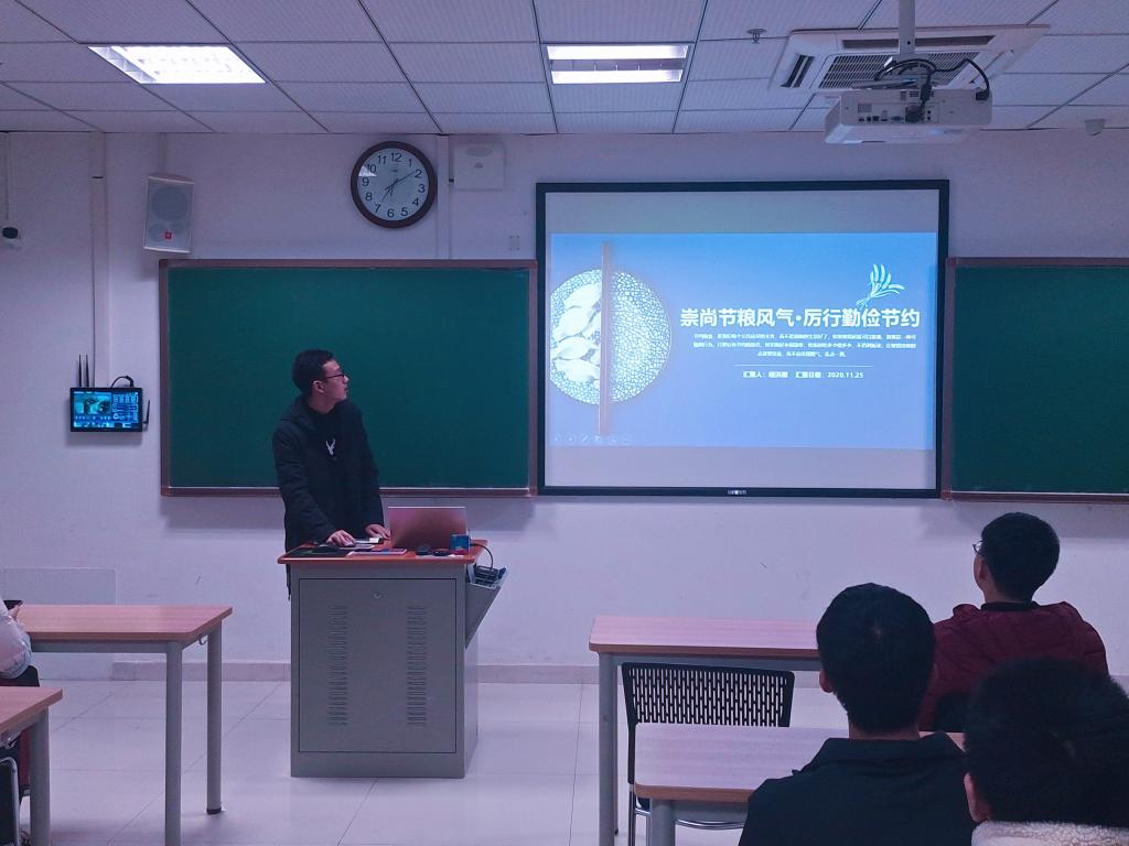 辅导员李明泽首先强调:“俭,德之共也;侈,恶之大也”,我们从小就被教育要有节约意识,为什么们都老员工了还要继续教育自己要节约粮食呢?节约是当下每个人必需的素质,营造节粮风气是时代一直久唱不衰的乐章,在为实现中华民族伟大复兴的中国梦而奋斗的青年身上更应体现出节约的作风,现在世界上仍然有很多百姓因吃不饱而受苦受累,如果我们能多节约点世界上就会少一个人挨饿。当然,我们不仅要节约粮食,也要节约用水用电用纸,绿色生活,养成一个良好的习惯就可以多为社会做出一点贡献。