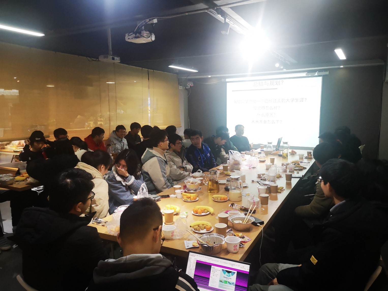 首先,任老师和同学们共进午餐,期间班长金昊同学以PPT的形式为大家讲述入校以来机械1802班一起经历的酸甜苦辣,带领同学们从“相遇的缘分”、“我们的故事”、“一起努力的身影”以及“难免的‘分别’”四个部分回忆两年半来的点点滴滴。午餐的尾声,金昊讲述了担任班长以来的心路历程以及他所观察到的同学们积极的变化,从学习、生活、工作等方面进行分析总结,最后陈述了他自己将来的打算。紧接着,每位同学就大学期间的得与失以及将来的规划做出总结分享。