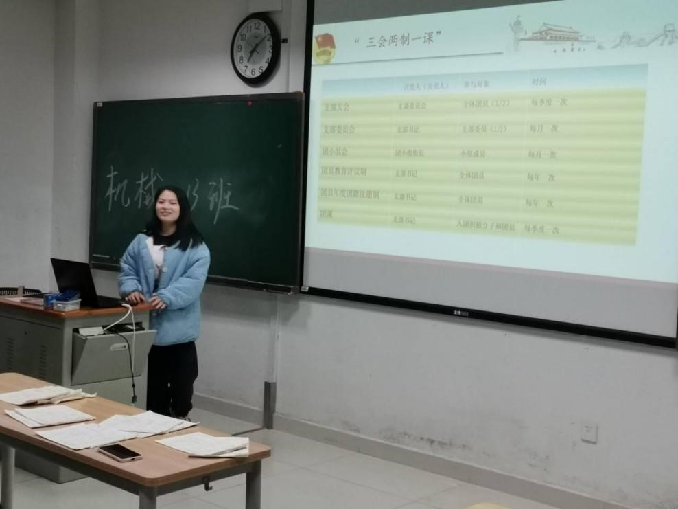 首先,团支书向我们详细讲解了中国共青团的相关内涵,并阐释了建设基层共青团工作的重大意义,明确了我们共青团员的两大任务:当好党的助手和后备军且做好党联系青年群众的桥梁和纽带。 最后向同学们普及了“三会两制一课”的相关知识。