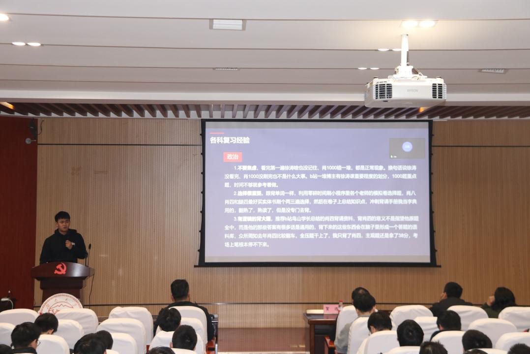 大会第一项,由贺迅书记发表讲话。贺迅书记为同学们分享了五项考研准则“努力拼搏,放松心态,绝不放弃,考完就去找工作,不要二战”,并从各个方面仔细讲述了这五项准则的含义。并传授给各位同学面试技巧,这不仅能用在找工作面试上,也能用在考研复试上。