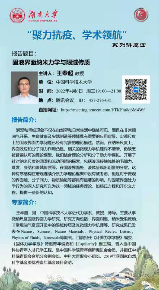 王奉超,男,中国科学技术大学近代力学系,教授、博导。主要从事微纳尺度固液界面力学研究,研究方向包括:界面润湿、纳米受限流动、非常规油气资源开发中的限域传质及其微观力学机理等。研究成果已发表在Nature,Science,Nature Materials,Physical Review Letters,Physics of Fluids,Nanoscale等期刊。目前担任《计算力学学报》编委、《固体力学学报》特邀青年编委和《Capillarity》副主编。曾入选中国科协青年人才托举工程,是中国科公司青年创新促进会会员,并担任中科院青促会合肥分会副会长、中科大青促会小组长。2019年获国家自然科学基金委优秀青年基金项目资助。