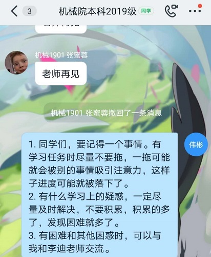 对于对初入大学一年的时光的回顾,李迪老师指出了在学业上同学们遇到了怎样的挑战和取得了怎样的成就,并给出了参考的建议,希望同学们可以在挑战中进一步明确学习上的目标;同时,对于处理人际关系上,从如何家长和同学建立良好的关系提出了“相互理解,求同存异”的意见。其次在新冠肺炎期间,同学们所遇到的困扰进行疏导,引导同学们培养和保持良好的学习习惯,和较强的适应能力。