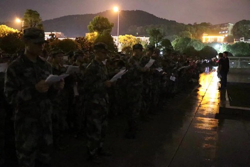 当晚21:15,19级新生在物电院前广场集合,整装待发。新生军训总负责吕凌泰就队列纪律与着装要求进行了强调,并带领新生喊出口号:“扬帆起航,劈波斩浪,耀耀破晓,璨以晨光”标志着少年的蜕变;“辛亥为始,生息不止,兴邦伟业,待我机械”展示了百年机械的气魄;“铸魂机械,炽烈华光,机立千仞,湘楚名扬”代表了勇于挑战、坚持到底的决心;“千年学府情飞扬,百年机械创辉煌,驰骋湖大,势不可挡”喊出了盼望勇夺魁首的不败战歌!