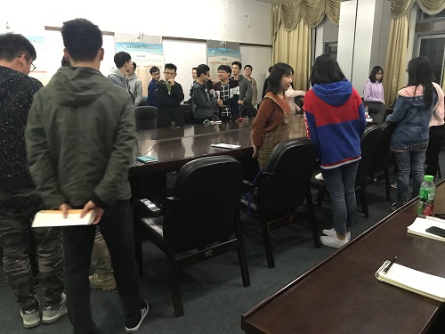 晚六点半,郑朝阳老师进行简短而又不失幽默的发言后正式开始培训。培训开始,郑朝阳老师首先让大家两两一组假装情侣进行心理情绪体验一。每组按照给出的词语进行表演,为了让大家清楚过程,郑老师亲自进行了演示。每组同学都很好地进行了表演,并进行了一致性情绪体验。